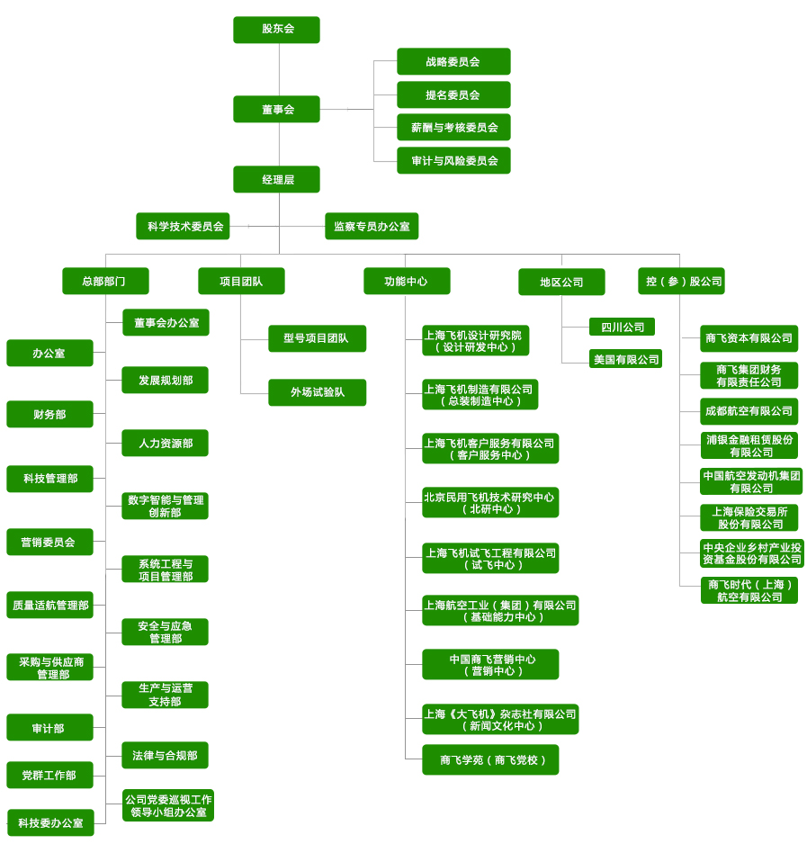 中國商飛于2008年5月11日成立,總部設在上海。由國務(wù)院國有資產(chǎn)監督管理委員會(huì )、上海國盛(集團)有限公司、中國航空工業(yè)集團有限公司、中國鋁業(yè)集團有限公司、中國寶武鋼鐵集團有限公司、中國中化股份有限公司共同出資組建,2018年底新增股東單位中國建材集團有限公司、中國電子科技集團有限公司、中國國新控股有限責任公司。